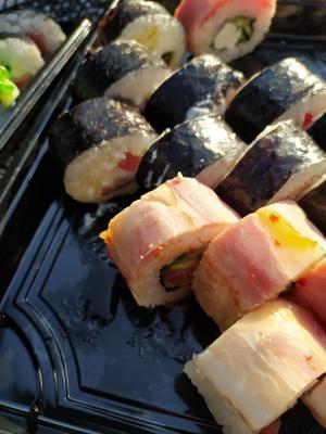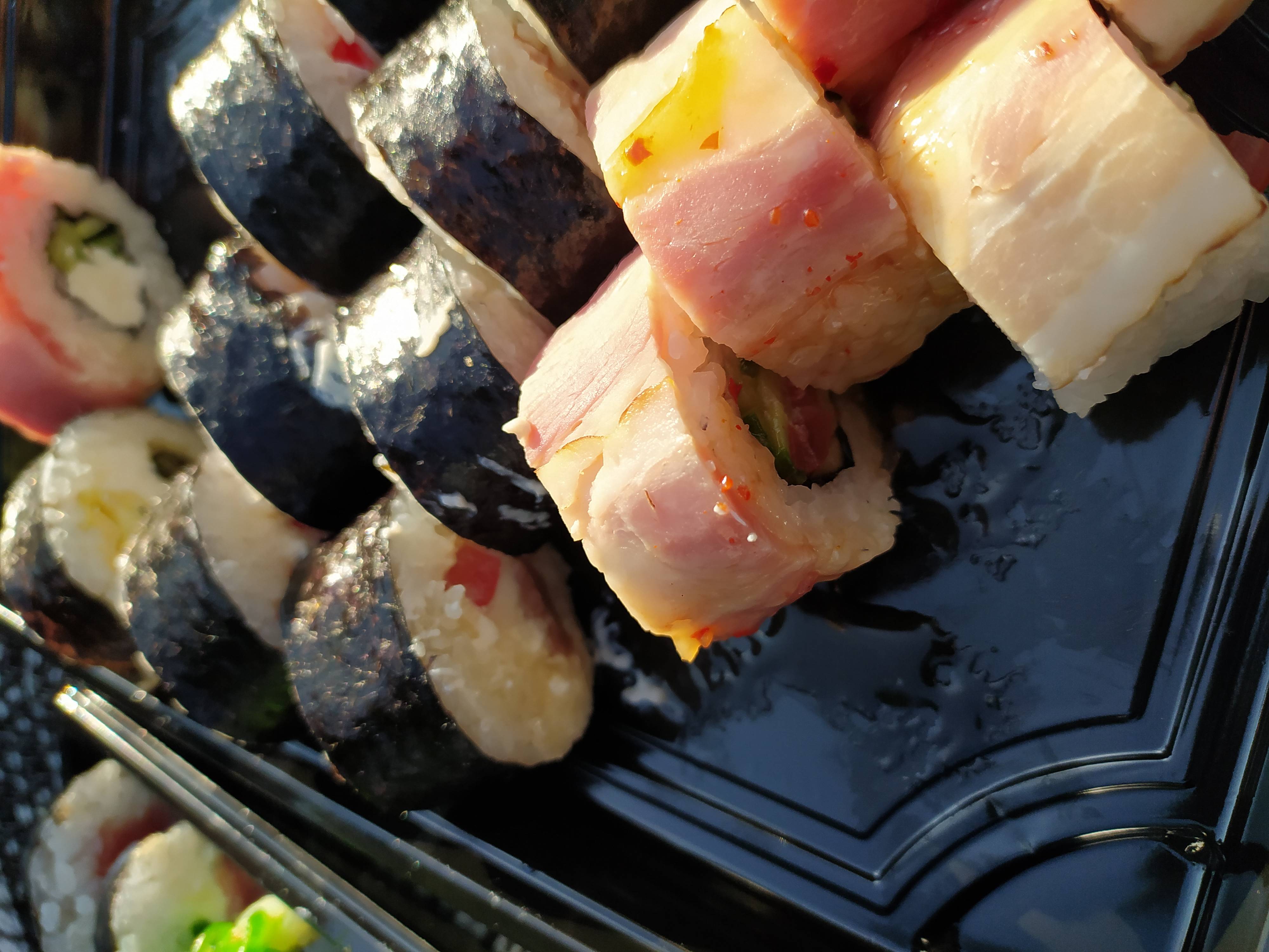 - ролл «В опаленном беконе с тунцом»: тунец, салат айсберг, сыр, бекон опаленный, соус терияки, кунжут, нори, рис – 8 шт.