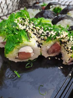 - ролл "Грин Крабс": краб-микс, имбирь, чука-салат, сыр, кунжут, нори рис - 8 шт.