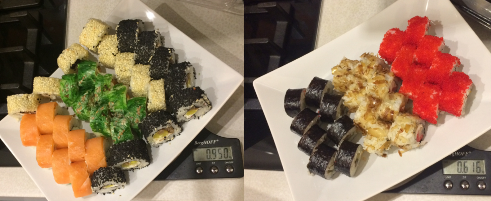 По весу почти не обманули. Эффект бабочки  - 1600 г. По вкусу все одинаковые. Средненько. Показалось. что большинство роллов просто для веса. Конечно на вкус и цвет... но врядли закажу еще раз