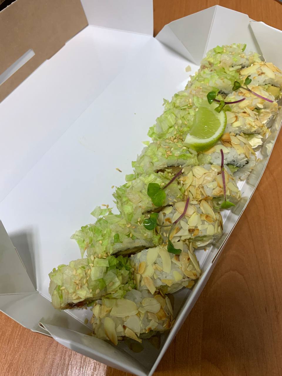 Заказали с коллегами разные роллы и среди коллег играли такую игру кто проиграл тому вег-ролы.  Я сам не веган но доволен что проиграл и мне достались вот эти вкусняшки.