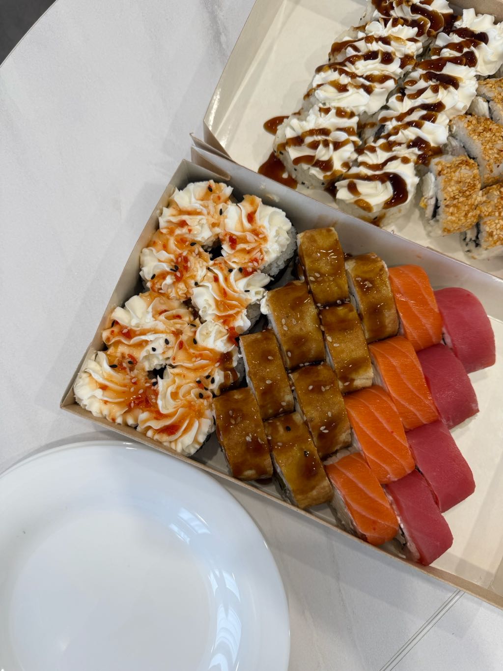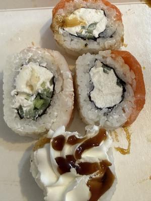 - В теплых ролла крайние кусочки отдаются запечатанными, так как большинству нравится дополнительная панировка на роллах!