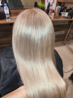 - сложное окрашивание волос (осветление в технике шатуш, омбре, балаяж, мелирование + тонирование + маска липидная, с учетом красителя):